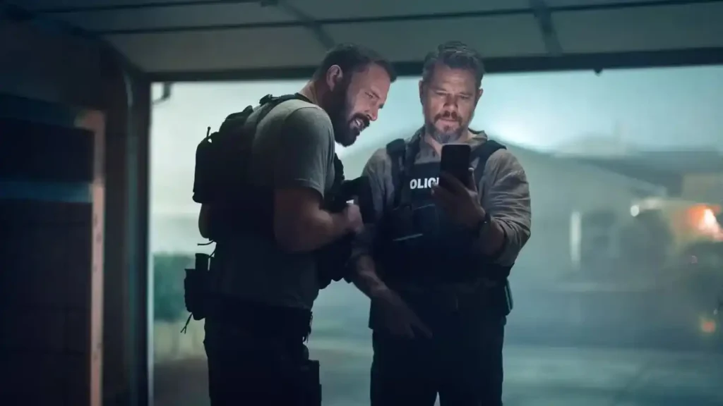 That self-awareness pays off especially in how the film handles Matt Damon and Ben Affleck. The marketing leans heavily on their real-life history, and Carnahan cleverly incorporates that baggage into the texture of the movie. Their characters’ bond mirrors what audiences already project onto the actors themselves. There’s not a lot of depth written into either role, despite the film’s occasional attempts to gesture toward it. Instead, the emotional stakes live in the performances we recognize: Affleck’s wounded expression when JD begins to believe Dane has betrayed him, Damon’s strained vulnerability when JD accuses him of wanting the money for himself. Carnahan, to his credit, understands that this is the real engine of the film and frames it accordingly.